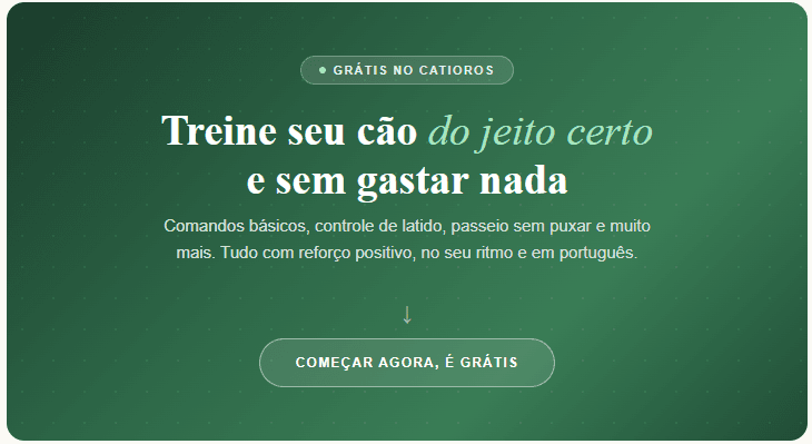 Se você está começando agora, o melhor ponto de partida é o App Catioros, que é gratuito e foi feito justamente para tutores brasileiros. Você encontra dicas de comportamento e orientações práticas sem precisar instalar nada nem pagar mensalidade. E ainda ganha nosso e-book de adestramento também! É só clicar na imagem abaixo.